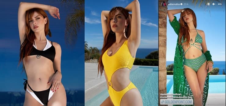 Nella prima foto, Annalisa indossa un bikini nero con dettagli bianchi che esalta il suo fisico lasciando intravedere anche il famoso tatuaggio al centro del decolletè. Trikini giallo, invece, nella seconda foto che le permette di lasciare libero il punto vita. Infine, nella terza foto, un bikini verde con dettagli bianchi con un modello che ricorda molto quelli degli anni Sessanta con un slip a vita alta.