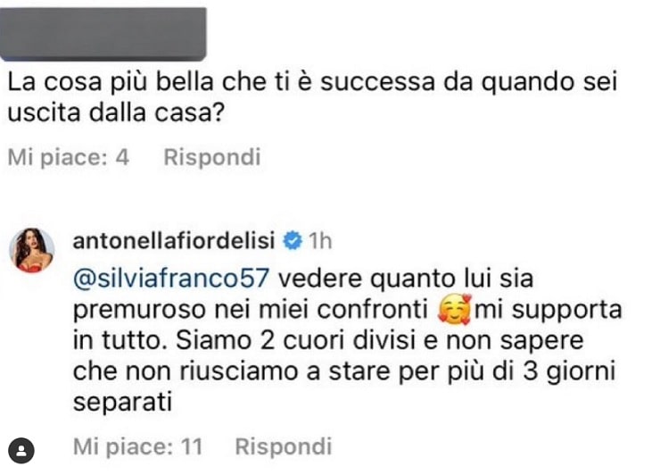 Sotto l’ultimo post in cui sponsorizza un brand continuando a lavorare come influencer dopo il grande successo della capsule di gioielli “The Queen Scacco matto”, Antonella ha risposto alle domande di alcuni fan che, tra le tante cose, le hanno chiesto la cosa più bella che le è capitata da quando ha lasciato la casa del Grande Fratello Vip. Nonostante la domanda generica, Antonella parlato espressamente del suo Edoardo con cui convive a Milano.