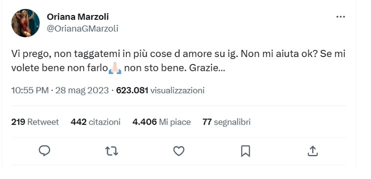 “Vi prego, non taggatemi più in cose d’amore su Instagram. Non mi aiuta ok? Se mi volete bene non fatelo, non sto bene. Grazie…”, ha cinguettato su Twitter.