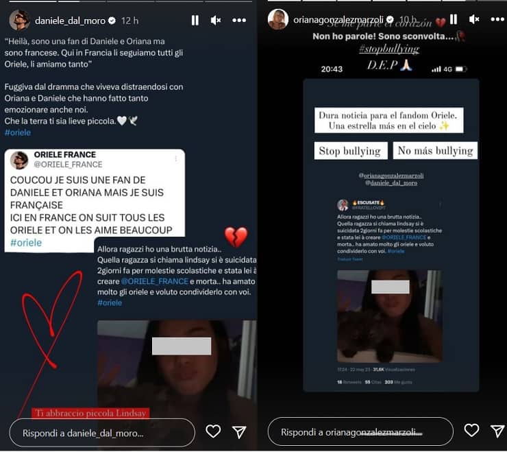 Entrambi, sui rispettivi profili Instagram, hanno condiviso una foto di Lindsay scrivendo dei toccanti messaggi. “Ti abbraccio piccola Lindsay. Grazie davvero piccola. Stop bullyng please“, ha scritto Daniele. “Sono sconvolta”, sono le parole scritte da Oriana che ha poi deciso di esprimere il proprio dolore attraverso un video.