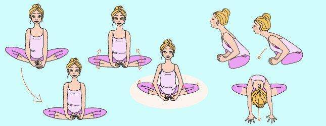 Siediti in posizione eretta con le ginocchia piegate in modo che gli archi si tocchino l’un l’altro. Posiziona i palmi delle mani nella posizione del ginocchio e premi delicatamente sul pavimento. Porta il tuo petto alle tue gambe. Spingere per 10, 20 secondi. Questa posizione ti aiuterà ad allungare lentamente il muscolo piriforme e i muscoli glutei.