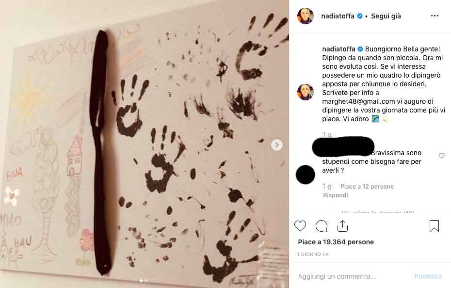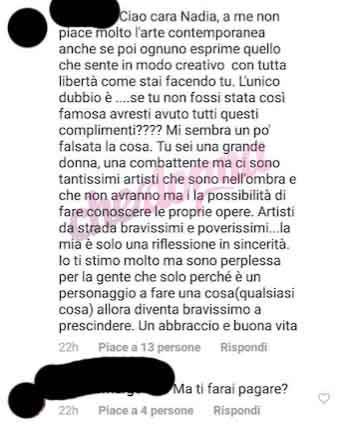 Tanti fans si sono chiesti come mai Nadia, ripetiamo, se fosse davvero quello il prezzo di un suo quadro, ossia 7000€, chieda una somma così elevata per una sua ‘opera d’arte’. C’è chi si domanda se la conduttrice si stia approfittando della buona fede dei suoi fans, chi crede che l’account della Iena sia stato hackerato, chi si chiede che fine faranno questi soldi nel caso in cui qualcuno decidesse davvero di spenderli, chi critica la ‘mano artistica’ di Nadia.
