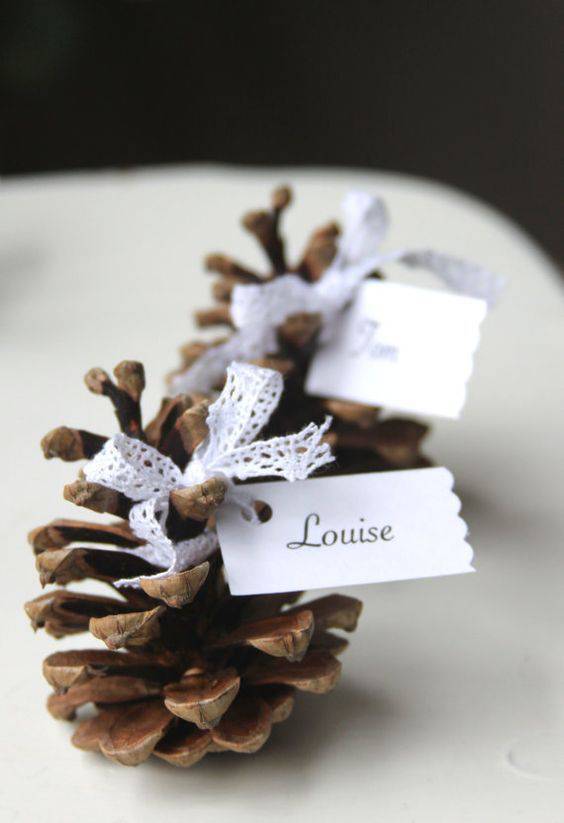 Una pigna può anche diventare un simpatico segnaposto: basta fissare una piccola etichetta con un nastro di pizzo o raso. Se, invece, volete realizzare dei segnaposto con una decorazione molto naturalistica, posizionate un cartoncino tra due piccoli rami impreziositi da un piccolo ramoscello di abete.