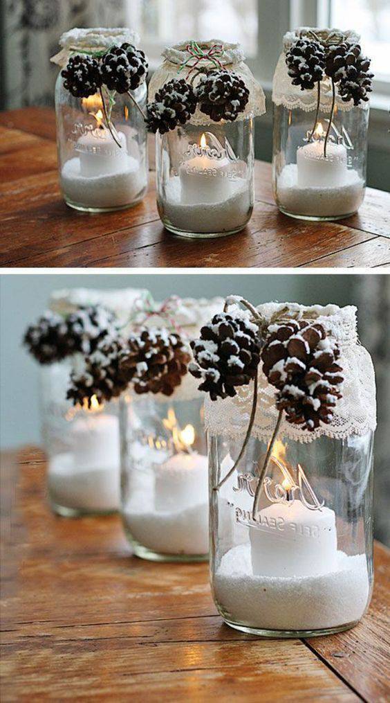 Per una tavola di Natale ricca di magia, non c’è niente di meglio di qualche punto luce da realizzare con l’aiuto di qualche tealight. È possibile realizzare dei tealight in vetro con un piccolo ramo di agrifoglio messo in acqua e sovrastato da una candela galleggiante. L’effetto finale è davvero incantevole. Se, invece, preferite portare sulla vostra tavola la dolcezza e la purezza di un Natale coperto di neve, optate per questa idea da realizzare con candele, un barattolo di vetro, un po’ di farina, merletti e pigne. Per chi ama la tradizione, questa decorazione è perfetta per fondere il classico all’originalità. Per realizzare questo portacandele sono sufficienti alcune piccole decorazioni natalizie, cotone, una stella di Natale artificiale e un bicchiere.
