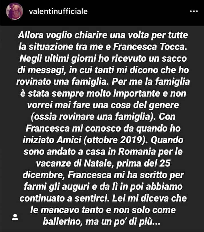 Valentin vuota il sacco e racconta tutta la verità sulla storia con Francesca Tocca. Dopo settimane di rumors, l’ex ballerino di Amici racconta di essersi innamorato di Francesca Tocca, ma di aver fatto un passo indietro mettendo al primo posto nella sua vita la famiglia. Stando a quello che scrive il ballerino, L’ex allievo di Amici e Francesca Tocca avrebbero avuto davvero una storia che, oggi, tuttavia, sarebbe finita per decisione di lui.