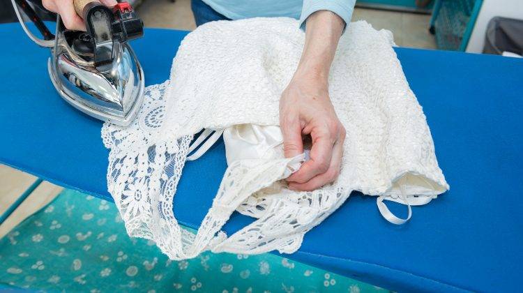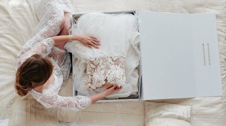 Dopo averlo lavato e stirato, l’abito da sposa è pronto per essere conservato nell’armadio. Si consiglia si usare la custodia fornita dall’atelier, perché proteggerà il tessuto dalla polvere.