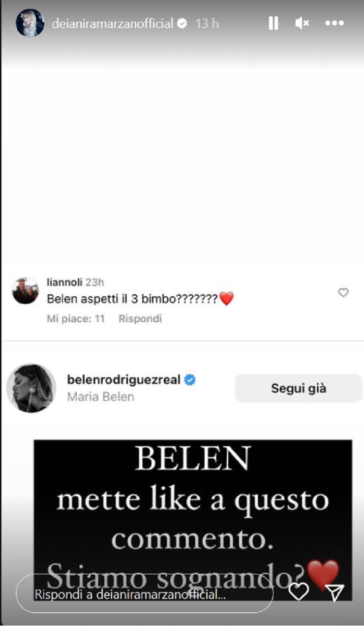 A riportarlo è stata Deianira Marzano che, tra le storie del proprio profilo instagram, ha pubblicato un post informando i propri followers del like lasciato da Belen alla domanda di una fan che le ha chiesto: “Belen aspetti il terzo bimbo?”.