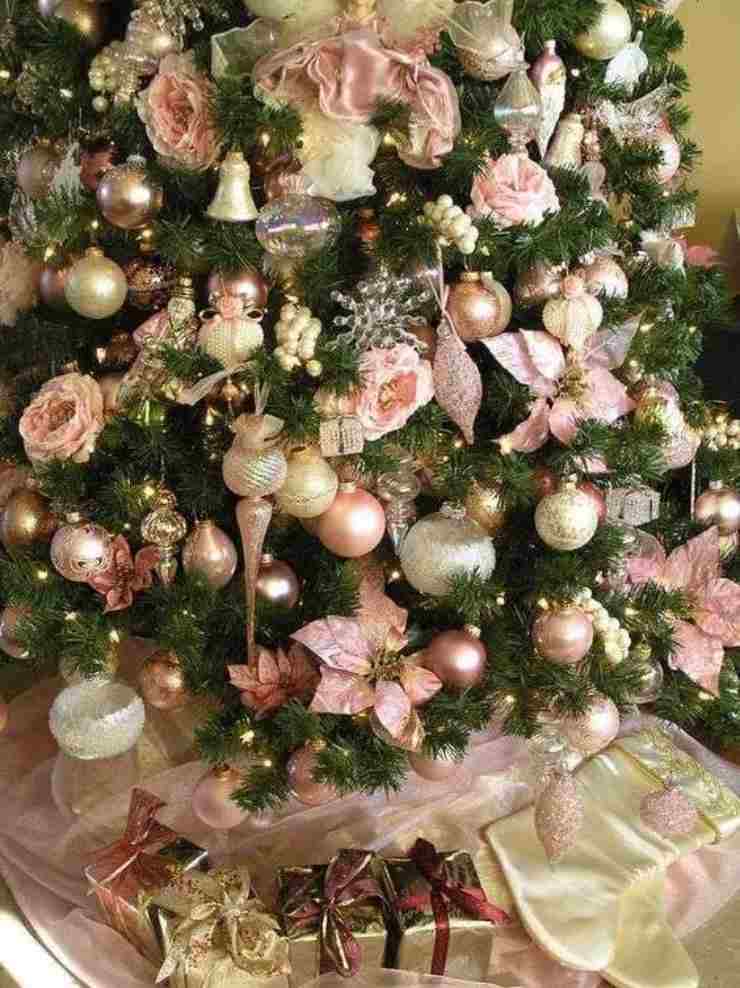E ora arriviamo alle decorazioni. In questi tipi di alberi sono molto belle non solo le solite palline ma anche tutto ciò che ci richiama il sottobosco, se scegliamo i toni dell’oro e del rosa, specialmente. Pensiamo a fatine, rose, fiori, elfi.