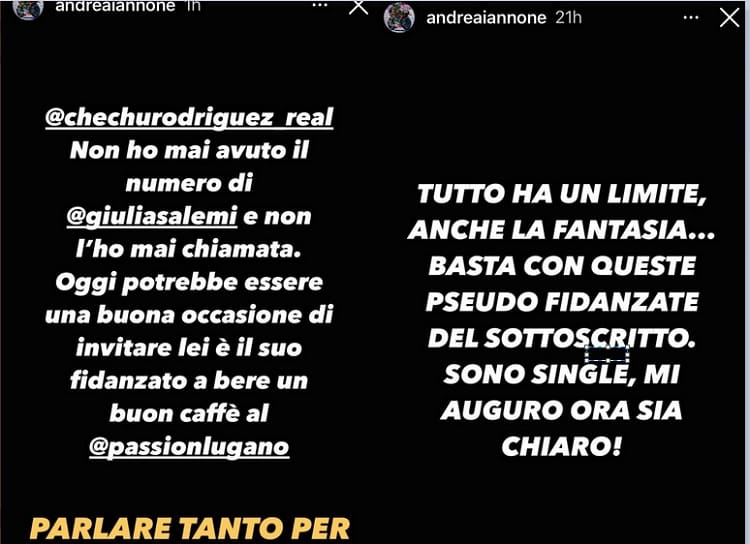Andrea Iannone e Pierpaolo Pretelli rispondono a Cecilia Rodriguez. La sorella di Belen, ospite di Tommaso Zorzi nella puntata del programma “Il Punto Z” del 5 maggio, ha parlato di Giulia Salemi svelando il motivo per cui ha smesso di seguirla sui social. Durante il racconto, Cecilia Rodriguez ha citato anche Andrea Iannone che ha prontamente replicato con una storia pubblicata su Instagram.