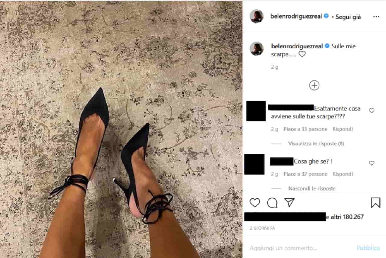La foto pubblicata da Belen Rodriguez è quella che vedete qui in alto. “Sulle mie scarpe“, si legge nella didascalia che accompagna lo scatto. Scarpe che sarebbero firmate The Attico come fa sapere la modella russa Maya Zaboshta che aveva pubblicato la stessa foto ad aprile 2020.