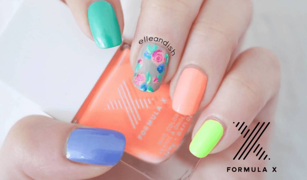 La nail art che vi proponiamo è di semplice e veloce realizzazione. Indice, anulare, mignolo e pollice dipinti ognuno di un colore, il medio adornato invece da un delizioso e romantico motivo floreale.