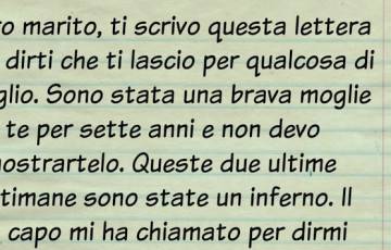 Caro marito, ti scrivo questa lettera per dirti che ti lascio per qualcosa di meglio. Sono stata una brava moglie per te per sette anni e non devo dimostrartelo. Queste due ultime settimane sono state un inferno. Il tuo capo mi ha chiamato per dirmi che oggi ti sei licenziato e questa e’ stata solo la tua ultima cazzata.