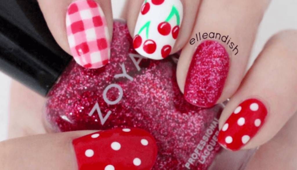Ciliegine, pois, glitter ed un frammento di tovaglia per impreziosire le unghie e renderle allegre e stravaganti. Siete pronte per le Cherry Picnic Nails? Via con il tutorial!