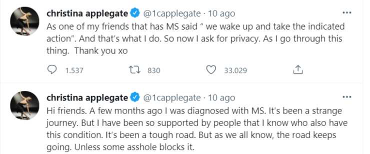 “Ciao amici. Pochi mesi fa mi è stata diagnosticata la sclerosi multipla“ ha esordito l’attrice sul suo profilo Twitter, senza fare troppi giri di parole. “È stato un viaggio strano, ma ho ricevuto grande sostegno dalle persone che conosco e che hanno la mia medesima malattia” ha confidato, rivelando che tutte le persone che le vogliono bene non l’hanno mai abbandonata, sostenendola come non mai.