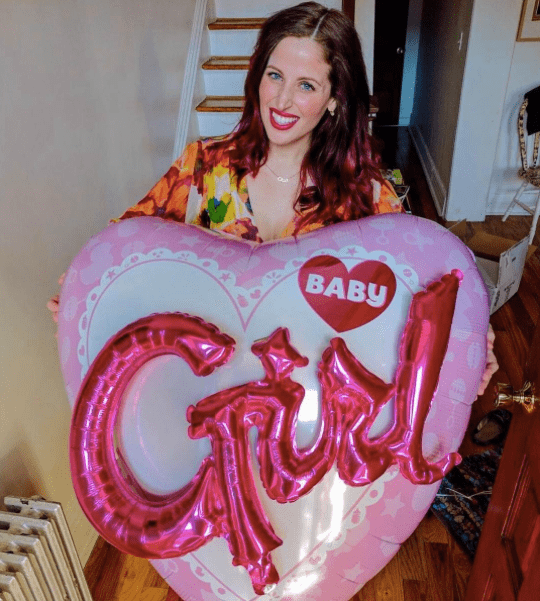 Nello scatto infatti, la make up artist mostra raggiante un megapalloncino a forma di cuore con scritto “Baby Girl”.