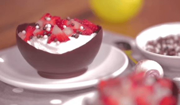 I palloncini, una volta gonfiati, saranno la ‘base’ di partenza per le ciotoline in cioccolato: il cioccolato andrà fuso a bagnomaria ed i palloncini vi andranno immersi per creare intorno ad essi un involucro in cioccolato che, una volta raffreddato e solidificato, sarà la base di questo dessert.