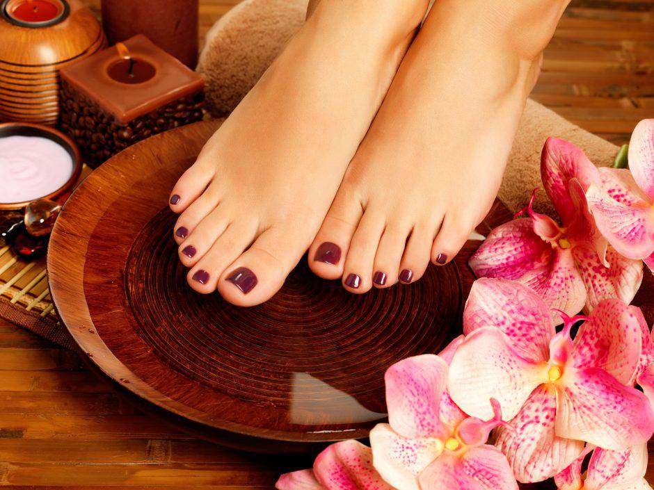 Prima di tutto eliminare ogni residuo di smalto con il solvente e mettere ammollo in una bacinella di acqua calda con bicarbonato ( 2 cucchiai) i piedi per circa 20 minuti.