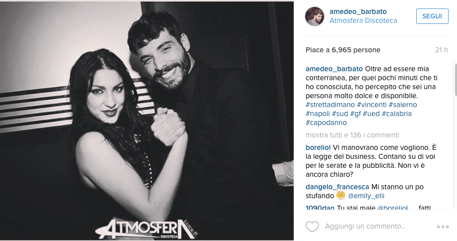 Il fantomatico flirt affibbiato solo il tempo di un caffè alla Lepanto è Amedeo Barbato, ex tronista di Uomini e Donne. I due sono stati ospiti all’interno della stessa serata, e subito i fans di entrambi i personaggi hanno sperato che tra i due ci potesse essere del tenero, soprattutto per le belle parole spese dal ragazzo su Instagram, nel commento che accompagna la foto dei due.