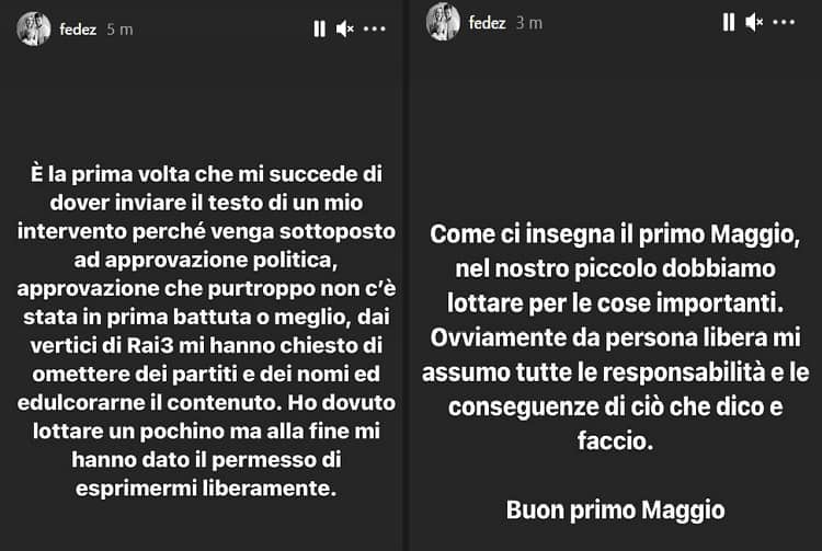 “Ho dovuto lottare un pochino, ma alla fine mi hanno dato il permesso di esprimermi liberamente“, aggiunge ancora il marito di Chiara Ferragni. “Come ci insegna il Primo Maggio, nel nostro piccolo dobbiamo lottare per le cose importanti”, dice ancora. “Ovviamente da persona libera mi assumo tutte le responsabilità e le conseguenze di ciò che dico e faccio. Buon Primo Maggio”, conclude il rapper.