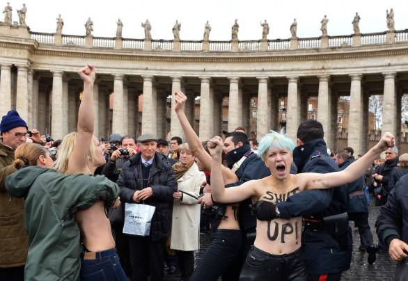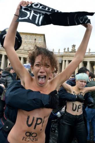 Non contente del forse poco scalpore attenuto dalla partecipazione alla trasmissione Announo, le attiviste hanno deciso di osare di più, di ‘scendere in campo’, ma forse stavolta il campo scelto per la loro battaglia e le armi usate, sono stati davvero esagerati. Tre Femen, come potrete vedere nel secondo video in basso, si sono recate di prima mattina a San Pietro, vestite di nero e vistosamente truccate, attirando già così l’attenzione di parecchi passanti e turisti. Le ragazze hanno poi deciso di spogliarsi per mettere in atto la loro protesta, sempre nei confronti del Papa, utilizzando in più un crocifisso ognuna, paragonandolo ad un sex toy, avvicinandolo al loro fondoschiena. La reazione della polizia è stata immediata, anche se purtroppo per alcuni secondi lo spettacolo blasfemo e offensivo ha avuto luogo.