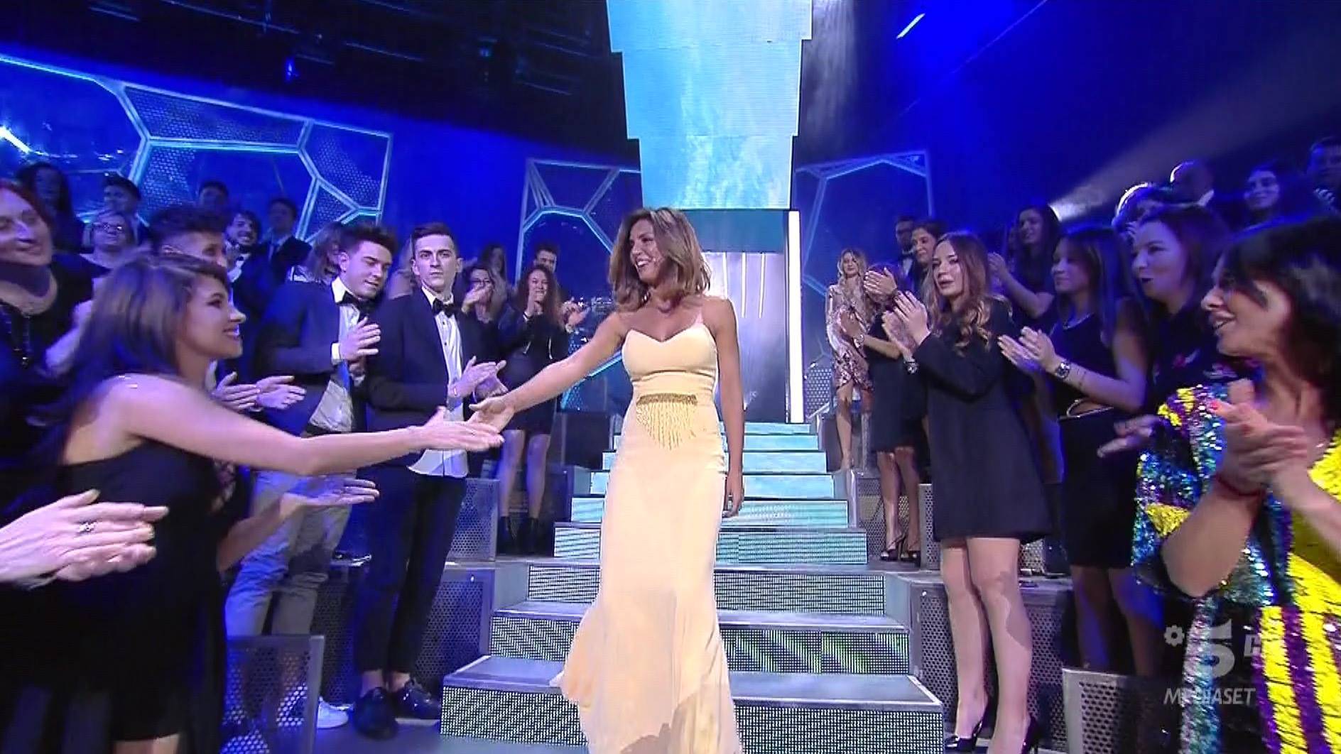In studio arrivano anche gli eliminati della scorsa puntata, tra cui Alessia Mancini in uno stupendo abito giallo pastello che mette in risalto la sua abbronzatura Onduregna.