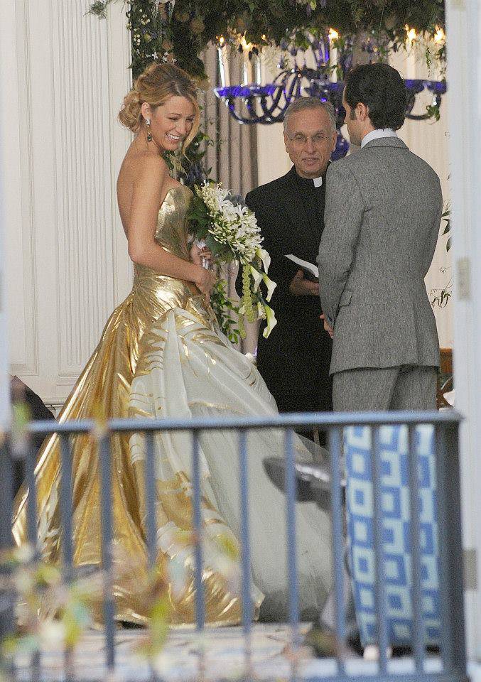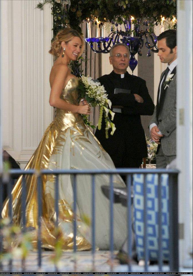 Dal set arriva l’ennesima “anticipazione fotografica” dell’ultimo episodio in assoluto di “Gossip Girl”. La splendida Serena Van Der Woodsen indossa un abito da sposa dorato e bianco, direttamente dalla Georges Chakra Spring-Summer 2012 Couture. Dan Humphrey indossa un completo grigio con inserti neri.