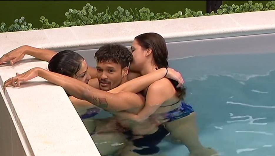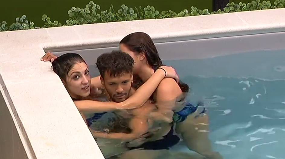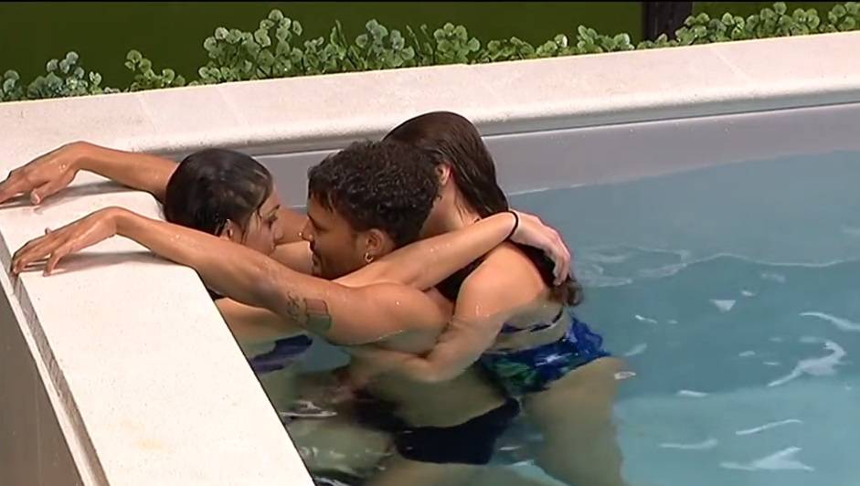 Tutti ormai sappiamo del debole di Kevin per la gemellina, cosa che lo porta a passare molti suoi momenti liberi in luoghi dove alloggia anche la ragazza. Il video che ci propone oggi il Grande Fratello farà discutere molti perchè, come dice Kevin scherzando sulla situazione della ragazza: ‘sei abbracciata a me, ti baci una donna e sei pure fidanzata’. Ebbene sì, avete capito bene, perchè oggi le due amiche, avvinghiate a Kevin in piscina, tra una battuta e l’altra decidono di cogliere la provocazione del modello padovano, scambiandosi un innocente bacio sulle labbra davanti a lui.