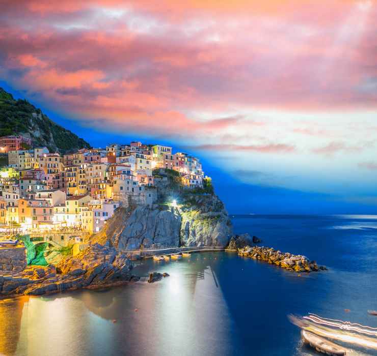 Le Cinque Terre, con i loro pittoreschi villaggi affacciati sul Mar Ligure, offrono uno scenario senza tempo per godersi un tramonto indimenticabile. Dai sentieri che collegano i borghi di Monterosso, Vernazza, Corniglia, Manarola e Riomaggiore alle scogliere che si tuffano nel mare, gli spettatori sono testimoni di un suggestivo spettacolo di luci e ombre mentre il sole scompare all’orizzonte, tingendo il cielo di arancio, rosa e viola.