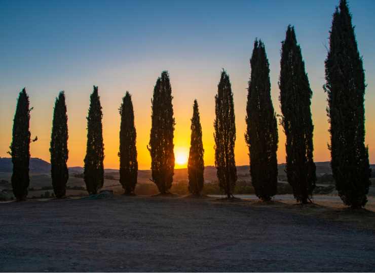 La Val d’Orcia, situata nel cuore della Toscana, è famosa per i suoi paesaggi caratterizzati da dolci colline ricoperte di vigneti e punteggiati da filari di cipressi. Al tramonto, la luce calda del sole che tramonta tinge il paesaggio di un’incantevole gamma di colori, rendendo questo momento magico e indimenticabile.