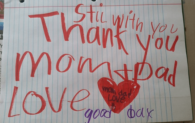 Questa triste storia sembra simile a tante altre purtroppo, eppure Leland ha fatto qualcosa di molto speciale per i suoi genitori. Quando sono tornati a casa infatti, Amber e Tim hanno trovato sul tavolo del salotto un bigliettino di addio scritto e disegnato dal figlio.