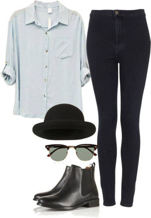 Blue Jeans scuri ed a vita altissima, stivaletti alla caviglia, una camicetta morbida celeste. A completare l’outfit una bombetta londinese ed un paio di occhiali da sole.