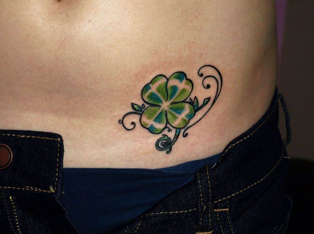 Questo tatuaggio è un esempio per coloro che desiderano fare un tatuaggio non tradizionale, non utilizzando il verde tradizionale e poco visibile ma sempre portatore di buona sorte.