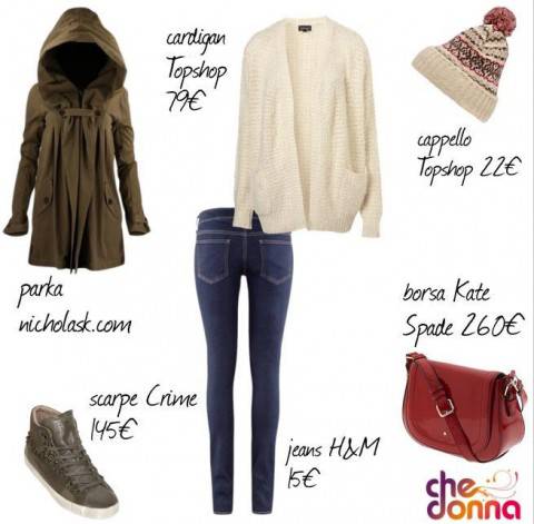Vediamo il tutto nel dettaglio: abbiamo abbinato un paio di jeans skinny blu scuro, firmati H&M, ad un cardigan aperto bianco firmato Topshop, da portare con sotto una t-shirt chiara a vostro piacimento. Sopra abbiamo aggiunto un parka verde militare con cappuccio, selezionato dal sito nicholask.com.