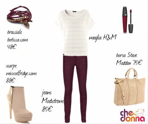 Per quanto riguarda gli accessori abbiamo scelto degli stivaletti alti in camoscio beige con borchie dorate sul tallone, selezionati dal sito missselfridge.com. La borsa invece, abbastanza grande da portare anche a tracolla, è beige con borchie dorate sul davanti, firmata Steve Madden. Infine abbiamo aggiunto un bracciale in tessuto burgundy con perline e ciondolo dorati, selezionato sul sito boticca.com.