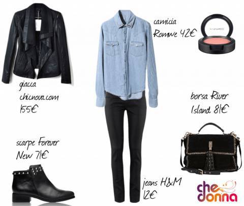 Vediamo il tutto nel dettaglio: abbiamo abbinato un paio di jeans skinny neri firmati H&M ad una camicia jeans con borchie dorate sul colletto e sul taschino, firmata Romwe. Sopra abbiamo aggiunto poi una giacca di pelle nera con collo oversize, selezionata dal sito chicnova.com.