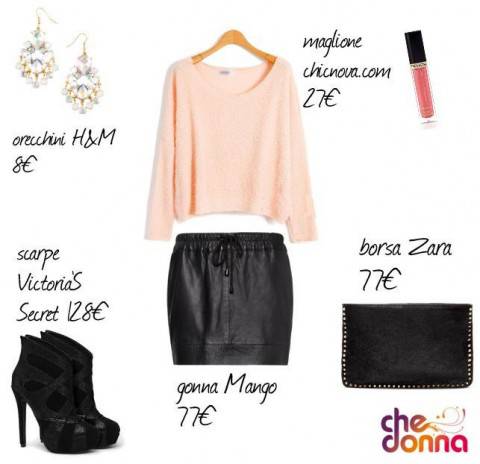Abbiamo abbinato questa minigonna di pelle con elastico in vita, firmata Mango ad un maglione morbido rosa chiaro da portare con la spalla scoperta, selezionato dal sito chicnova.com.