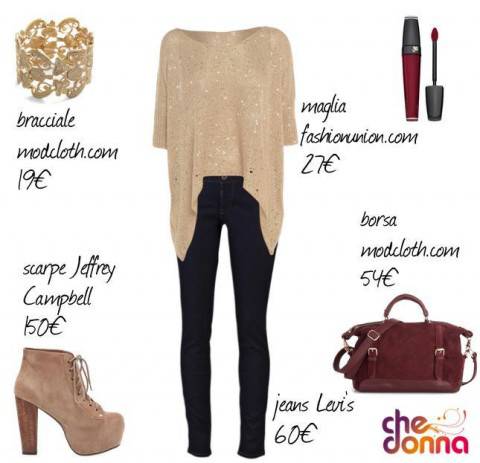 Vediamo il tutto nel dettaglio: abbiamo abbinato un paio di jeans skinny blu scuro firmati Levi’s ad una maglia larga beige con paillettes selezionata dal sito fashionunion.com.