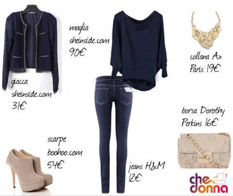 Vediamo il tutto nel dettaglio: abbiamo abbinato un paio di jeans skinny blu scuro firmati H&M ad una maglia blu morbida con scollatura ampia, selezionata dal sito sheinside.com. Sopra abbiamo aggiunto una giacca blu “stile Chanel” con profili dorati, selezionata sempre dal sito sheinside.com.