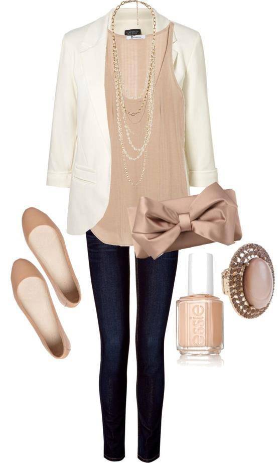 Questo look bon-ton è delicato sia nei colori, scegliendo le nuances del panna e dello champagne, sia nell’accostamento dei capi. Una canotta in seta morbida che scivola senza segnare le curve, una giacca in jersey panna, un jeans slim e per dare un tocco ancora più ‘innocente’ il tutto è accompagnato da una ballerina color champagne.