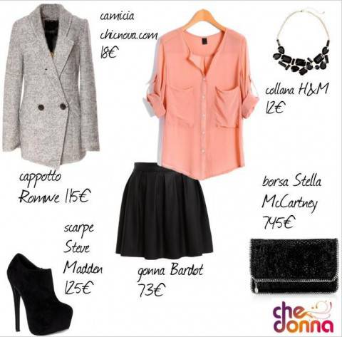 Vediamo il tutto nel dettaglio: abbiamo scelto una gonna a pieghe in ecopelle nera, firmata Bardot, da indossare con delle calze velate nere. Sopra abbiamo abbinato una camicia in chiffon rosa pastello, selezionata dal sito chicnova.com. Infine abbiamo aggiunto un cappotto doppiopetto in lana grigio chiaro, firmato Romwe.