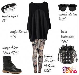 Vediamo il tutto nel dettaglio: abbiamo abbinato un paio di leggings dalla fantasia particolare nei colori beige, nero e rosa antico, firmati Alexander McQueen ad una maxi maglia nera a maniche lunghe in cotone e raso, firmata Romwe.