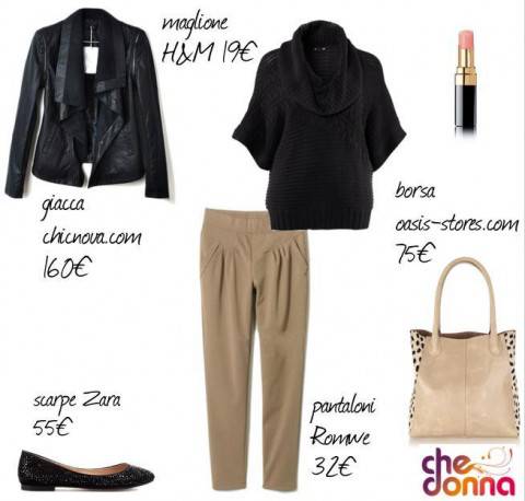 Vediamo il tutto nel dettaglio: abbiamo abbinato un pantalone beige che arriva all’altezza della caviglia, firmato Romwe, ad un maglione nero con maxi collo e maniche a ¾, firmato H&M. Sopra abbiamo aggiunto una giacca di pelle nera, selezionata dal sito chicnova.com.