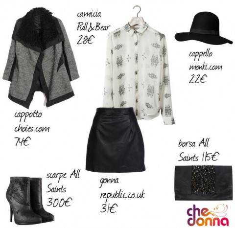 Per quanto riguarda gli accessori abbiamo scelto dei tronchetti in pelle lavorata nera con tacco a spillo e come borsa una clutch nera con dettaglio in pietre e borchie, entrambi firmati All Saints. Per completare il nostro look abbiamo aggiunto un cappello nero in tessuto con falda larga, che rende il tutto molto chic, selezionato dal sito monki.com.
