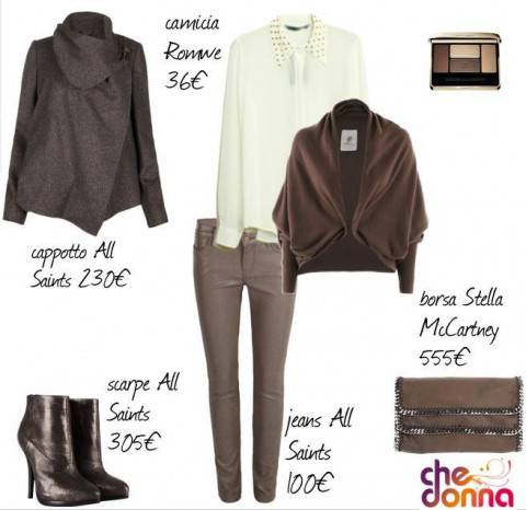 Per quanto riguarda gli accessori abbiamo scelto dei tronchetti in pelle marrone leggermente satinata, firmati All Saints e una clutch marrone chiaro di Stella McCartney.