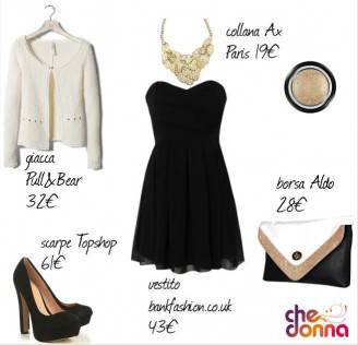 Vediamo il tutto nel dettaglio: abbiamo scelto un vestito nero con corpetto a cuore e gonna che scende morbida fin sopra il ginocchio. È un vestito semplice ma molto raffinato, selezionato dal sito bankfashion.co.uk. Sopra abbiamo aggiunto una giacca bianca in tweed “stile Chanel” firmata Pull&Bear.