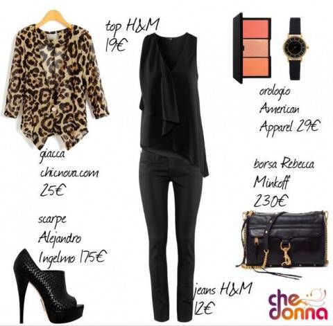 Vediamo il tutto nel dettaglio: abbiamo abbinato un paio di jeans skinny neri ad un top nero sbracciato con scollatura a V e volant davanti, entrambi firmati H&M. Sopra abbiamo aggiunto una giacca in chiffon a fantasia leopardata, selezionata dal sito chicnova.com.