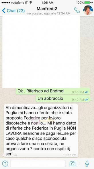 Ad aver fatto infuriare la ragazza stavolta è stato Domenico Manfredi, autore di un messaggio WhatsApp inviato a ‘ignoti organizzatori’ dove Manfredi critica la ragazza per avergli “rubato” delle serate in discoteca in Puglia. L’sms è arrivato per caso tra le mani della vincitrice del GF, postato poi dalla stessa sulla sua pagina Facebook per farlo leggere ai suoi fans e ‘svelare’ che persona sia il pugliese. Ecco riportato lo screen dell’sms, anche se il messaggio in oggetto è sparito da tutti gli account social dei diretti interessati