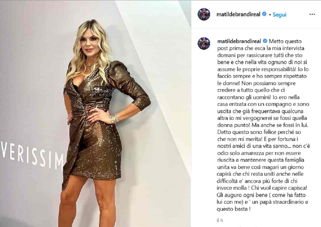 Dopo aver annunciato la fine della sua lunga storia con Marco Costantini a Verissimo, Matilde Brandi, con un lungo post su Instagram, ha svelato ulteriori dettagli della rottura. La showgirl tesse le lodi dell’ex compagno come padre, ma si dice felice che la storia sia finita, sicura di meritare un amore più grande.