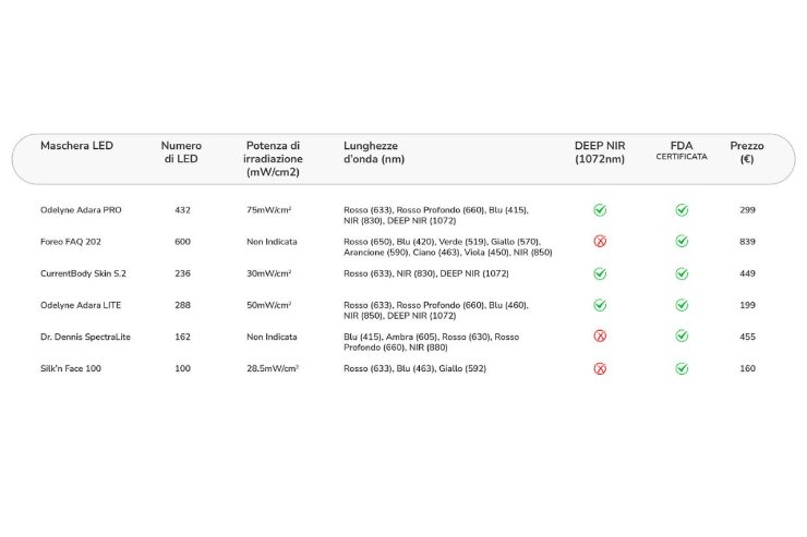 L’efficacia di una maschera LED dipende da tre fattori: la lunghezza d’onda, la potenza di irradiamento (mW/cm²) e la durata di esposizione. Le lunghezze d’onda più studiate e con risultati clinicamente validati sono: