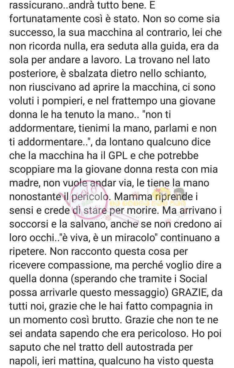 Per estrarla dalla vettura è stato necessario l’intervento dei vigili del fuoco e nel frattempo una meravigliosa sconosciuta le ha tenuto la mano spronandola a non cedere. Dopo un bel po’ di tempo e di paura i pompieri sono riusciti ad estrarre la mamma di Oscar e Dalila dai rottami della macchina e l’hanno condotta in ospedale in codice rosso.